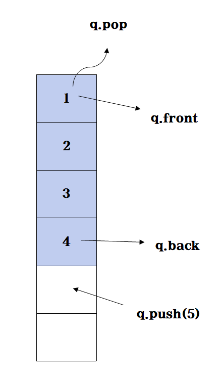- 제한적인 데이터 삽입/삭제: 데이터를 삽입하는 경우는 큐의 맨 뒤에 새로운 데이터를 추가하고, 데이터를 삭제하는 경우는 큐의 맨 앞에서 데이터를 삭제한다.