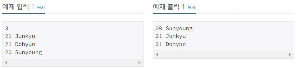 첫째 줄부터 총 N개의 줄에 걸쳐 온라인 저지 회원을 나이 순, 나이가 같으면 가입한 순으로 한 줄에 한 명씩 나이와 이름을 공백으로 구분해 출력한다.
