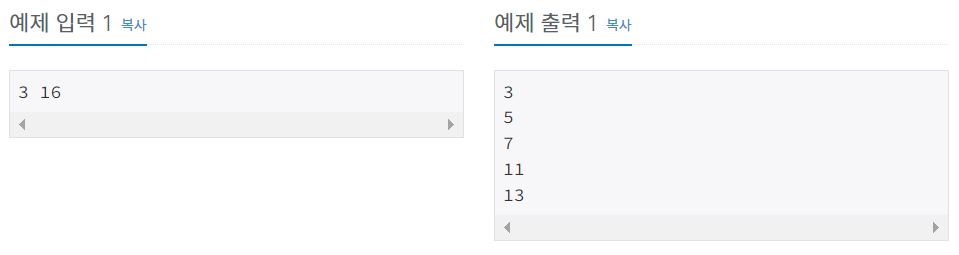 첫째 줄에 자연수 M과 N이 빈 칸을 사이에 두고 주어진다. (1 ≤ M ≤ N ≤ 1,000,000) M이상 N이하의 소수가 하나 이상 있는 입력만 주어진다.