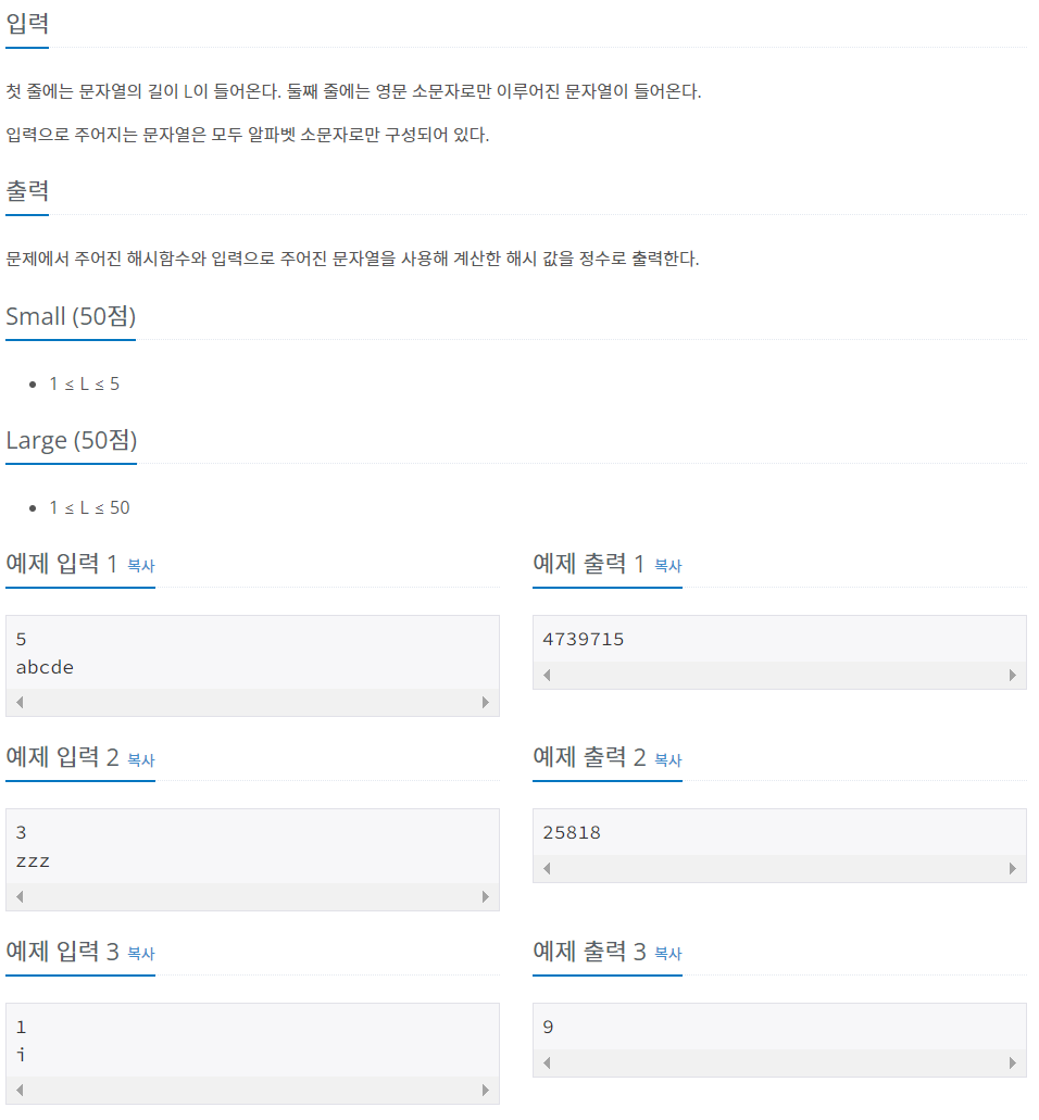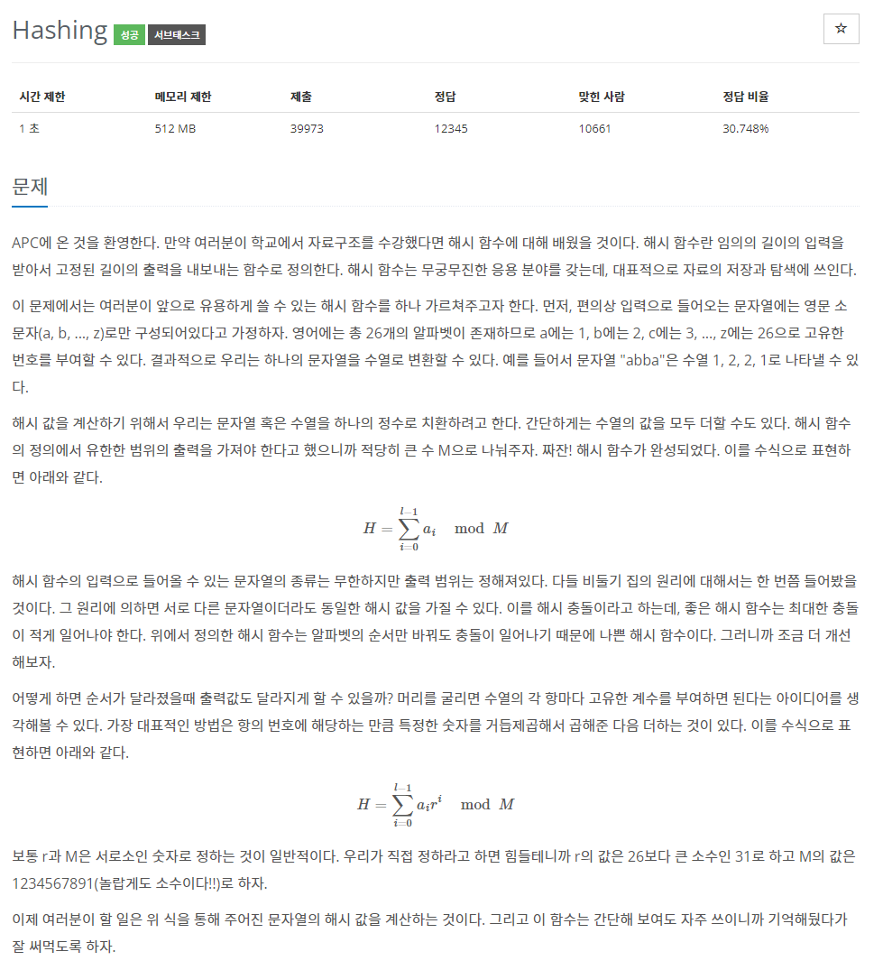 이 문제는 한마디로, 문자열 각 인덱스의 문자값에 고유 계수를 거듭제곱한 값을 곱하여 그 수들을 더한 해시값을 구하라는 것이다.
