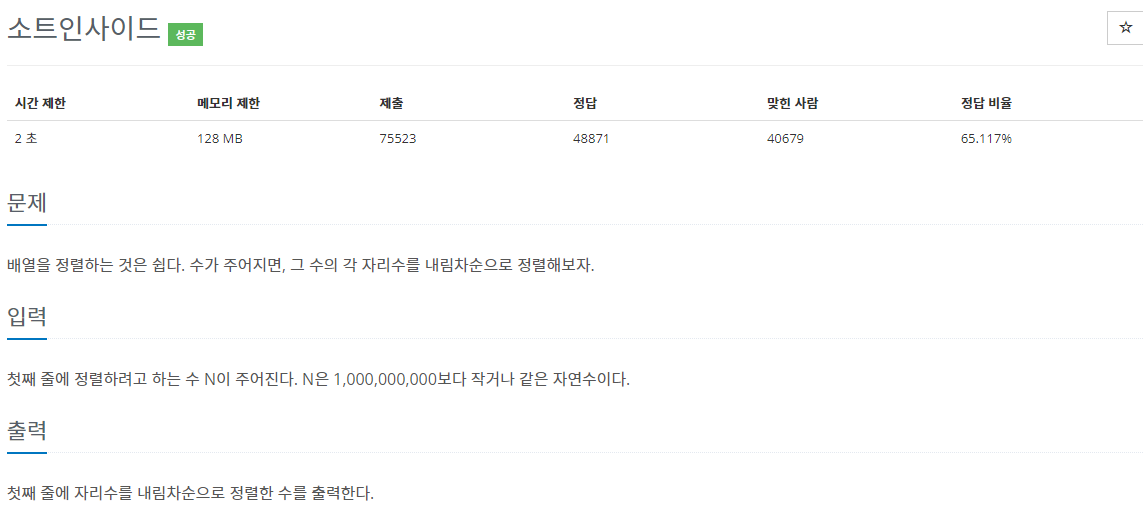 문제 링크: https://www.acmicpc.net/problem/1427