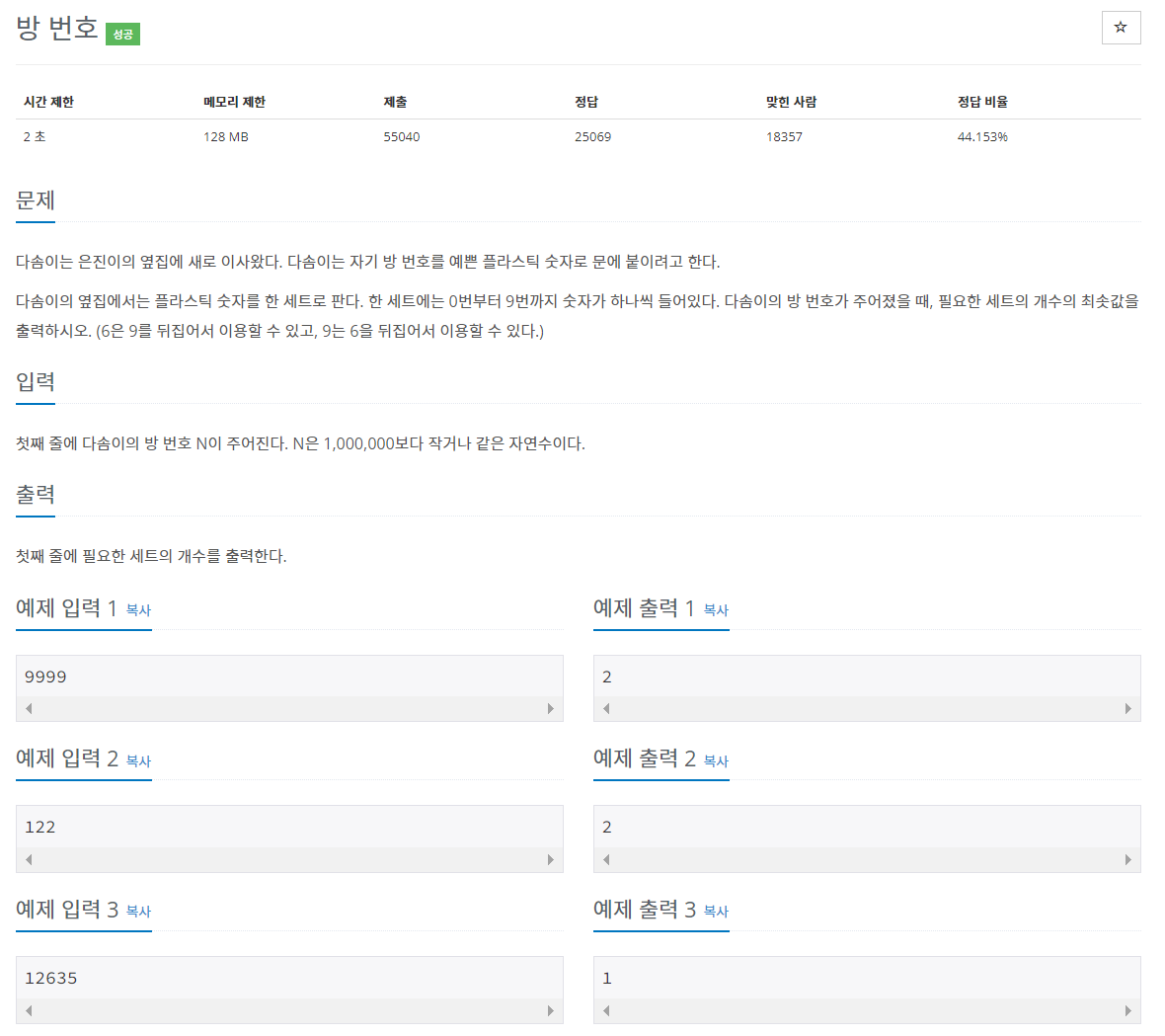 다만 6과 9는 각 수가 세트에 존재하지 않을 때(이미 썼을 때) 바꿔 쓸 수 있기 때문에둘의 등장 횟수는 적절히 반으로 나누어 저장하면 된다.