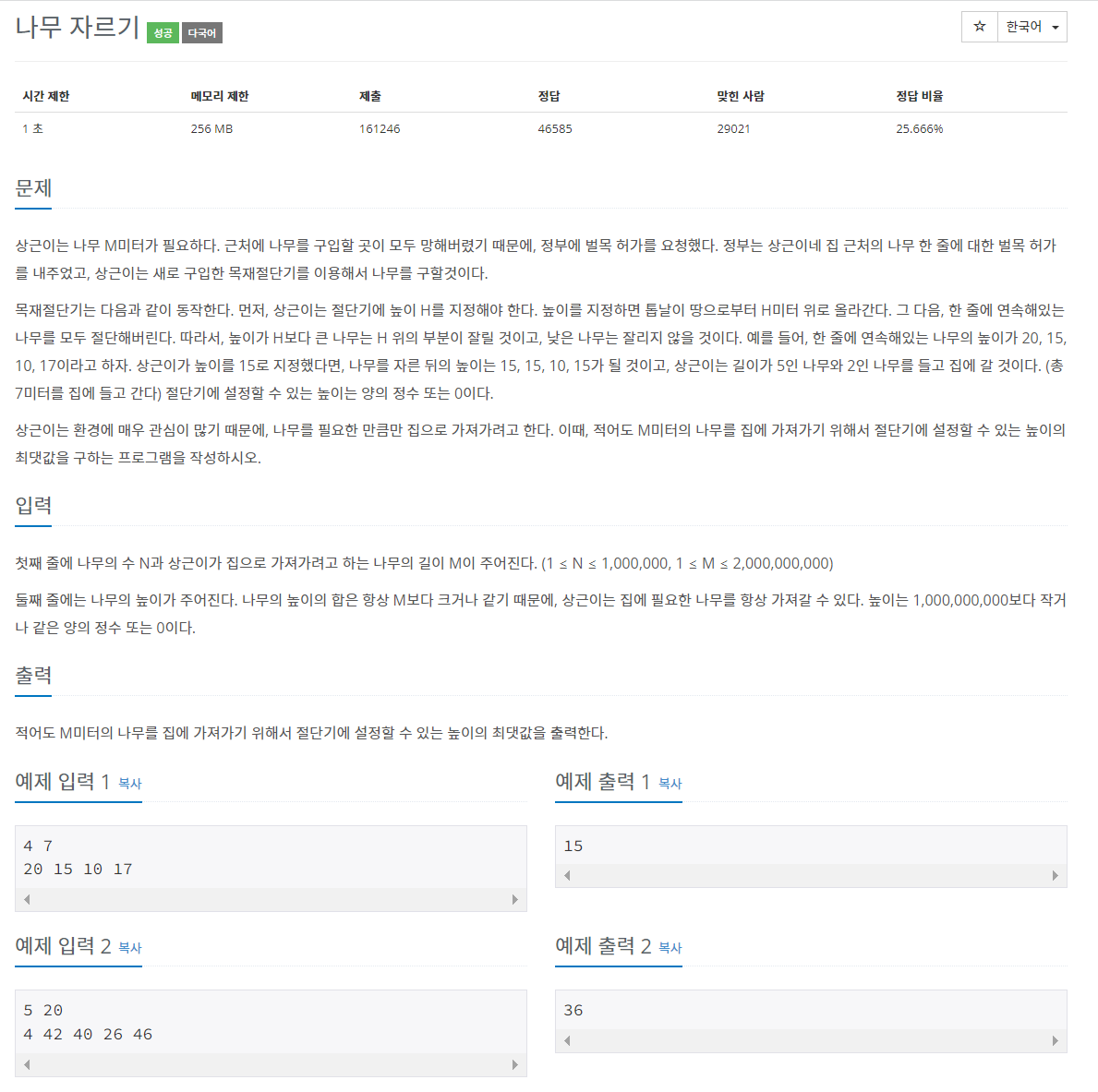 문제 링크: https://www.acmicpc.net/problem/2805