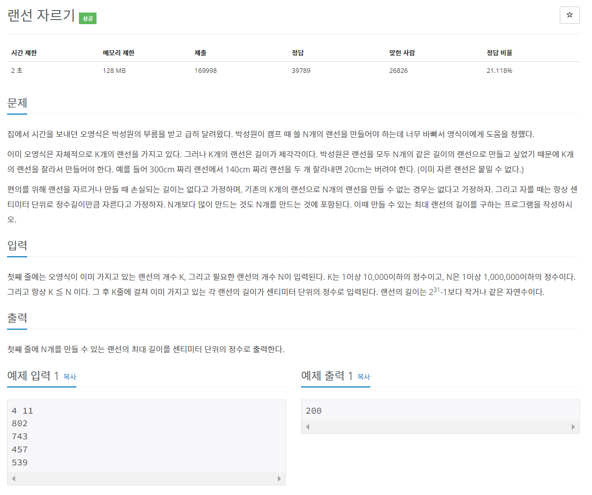 첫째 줄에는 오영식이 이미 가지고 있는 랜선의 개수 K, 그리고 필요한 랜선의 개수 N이 입력된다. K는 1이상 10,000이하의 정수이고, N은 1이상 1,000,000이하의 정수이다. 그리고 항상 K ≦ N 이다. 그
