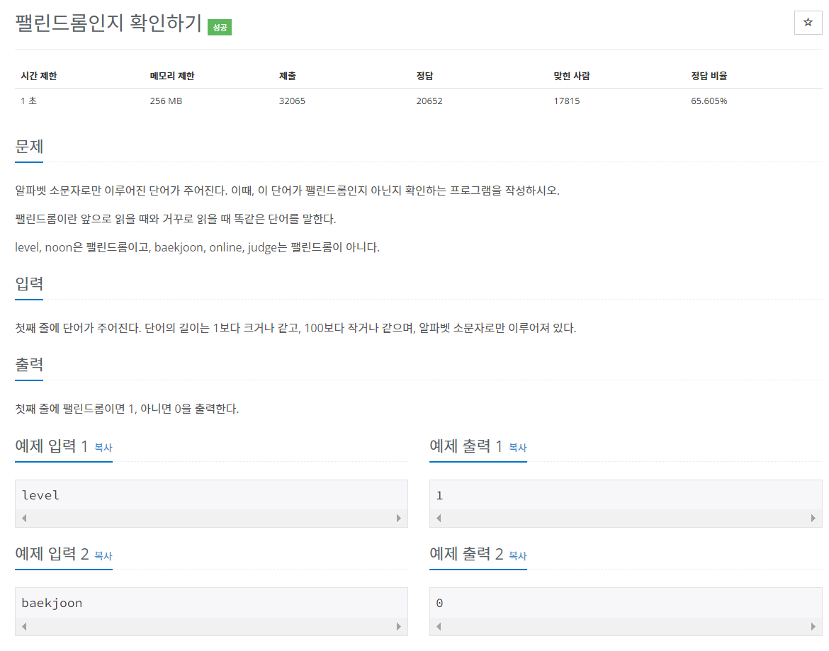 앞으로 읽으나 뒤로 읽으나 똑같은 문자열인지 판단하는 문제이다.