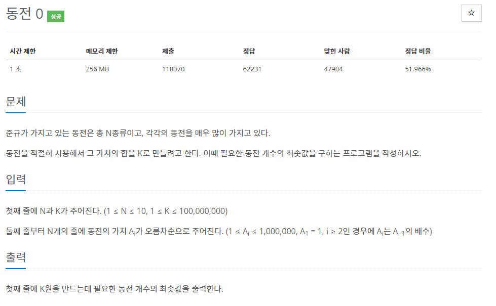 첫째 줄에 N과 K가 주어진다. (1 ≤ N ≤ 10, 1 ≤ K ≤ 100,000,000) 둘째 줄부터 N개의 줄에 동전의 가치 Ai가 오름차순으로 주어진다. (1 ≤ Ai ≤ 1,000,000, A1 = 1, i ≥ 2인 경우에 Ai는 Ai-1의 배수)