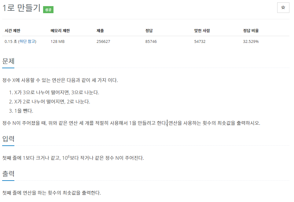 - 3으로만 나누어 떨어지는 수: 1 + dp[index/3] 또는 1 + dp[index-1] (둘 중 최솟값)