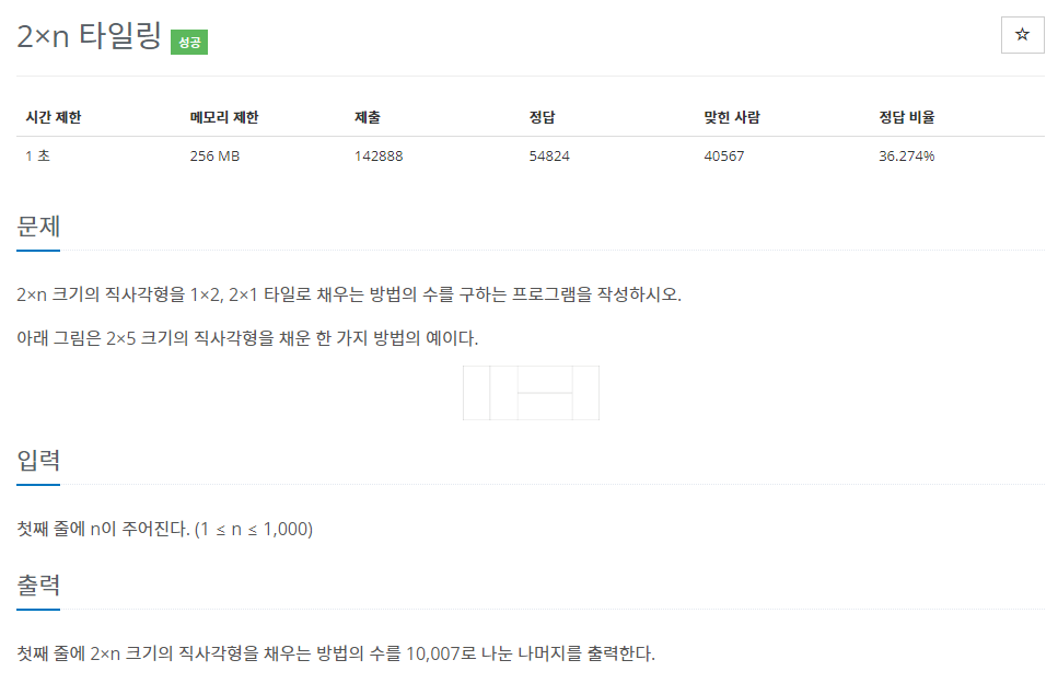 2×n 크기의 직사각형을 1×2, 2×1 타일로 채우는 방법의 수를 구하는 프로그램을 작성하시오. 아래 그림은 2×5 크기의 직사각형을 채운 한 가지 방법의 예이다.
