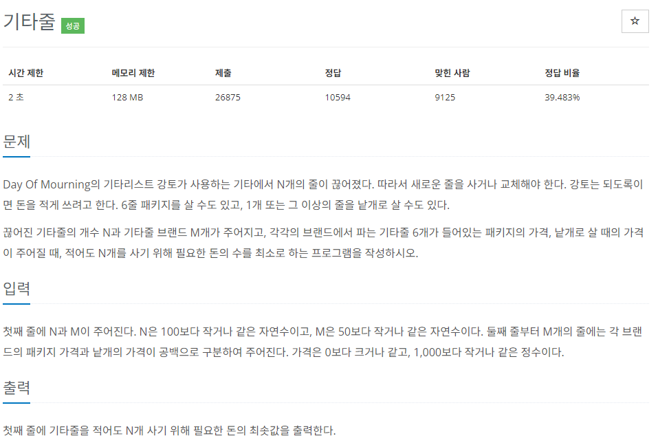 어떤 조합으로 사야 최솟값으로 끊어진 기타줄을 바꿀 수 있는지이다.