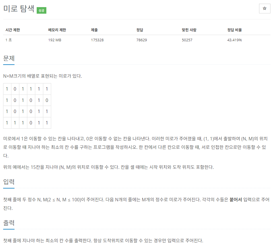 첫째 줄에 두 정수 N, M(2 ≤ N, M ≤ 100)이 주어진다. 다음 N개의 줄에는 M개의 정수로 미로가 주어진다. 각각의 수들은 붙어서 입력으로 주어진다.