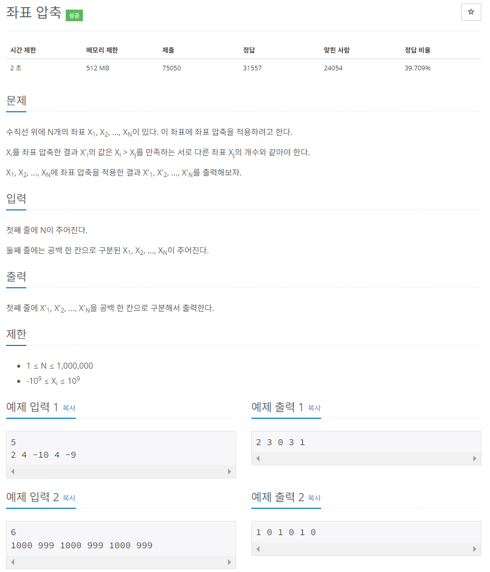 수직선 위에 N개의 좌표 X1, X2, ..., XN이 있다. 이 좌표에 좌표 압축을 적용하려고 한다. Xi를 좌표 압축한 결과 X'i의 값은 Xi > Xj를 만족하는 서로 다른 좌표 Xj의 개수와 같아야 한다. X1, X2, ..., XN에