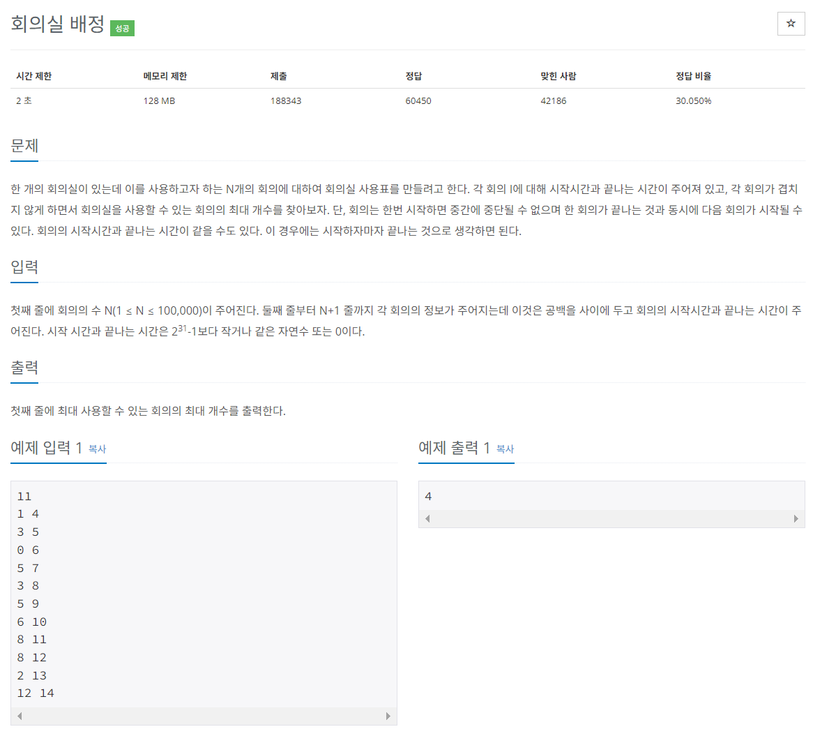 시작 시간과 끝나는 시간 사이에 겹치는 회의 시간이 없이 사용 가능한 최대 회의 개수를 구하는 문제이다.