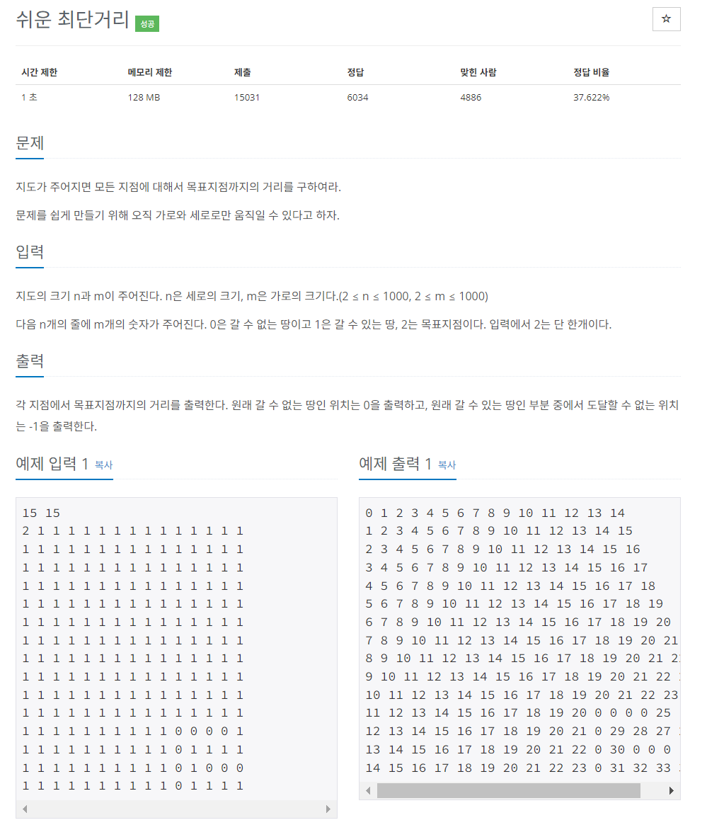 지도의 크기 n과 m이 주어진다. n은 세로의 크기, m은 가로의 크기다.(2 ≤ n ≤ 1000, 2 ≤ m ≤ 1000) 다음 n개의 줄에 m개의 숫자가 주어진다. 0은 갈 수 없는 땅이고 1은 갈 수 있는 땅, 2는 목표지점이