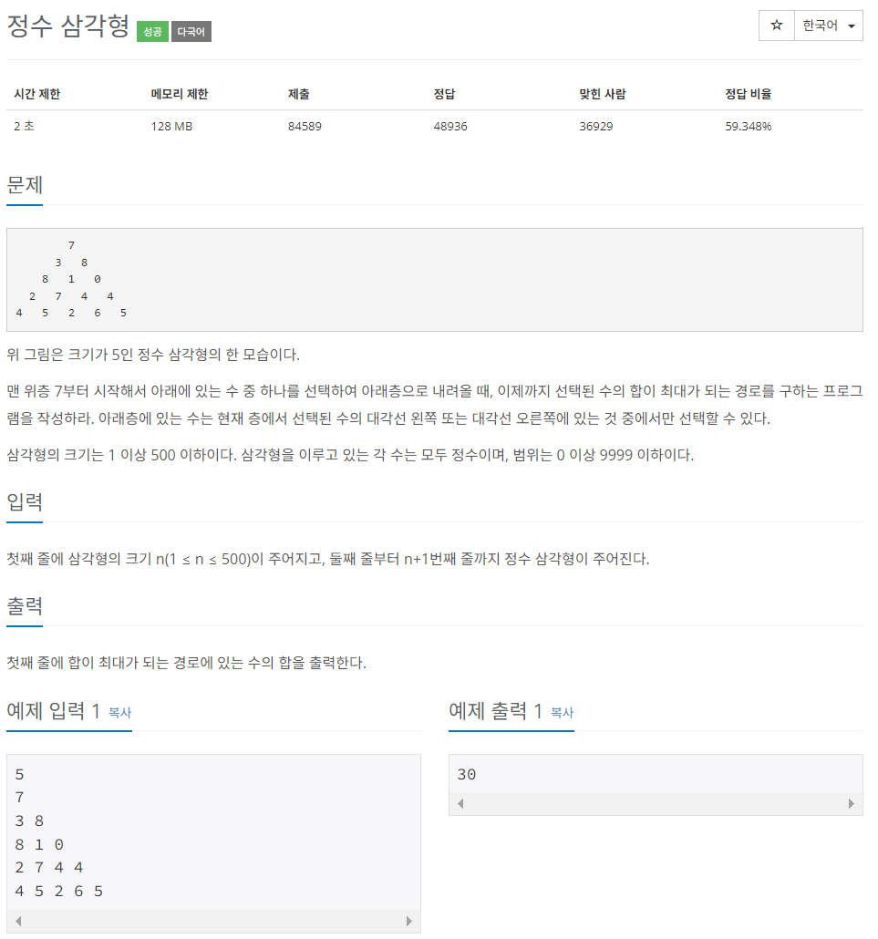 첫째 줄에 삼각형의 크기 n(1 ≤ n ≤ 500)이 주어지고, 둘째 줄부터 n+1번째 줄까지 정수 삼각형이 주어진다.
