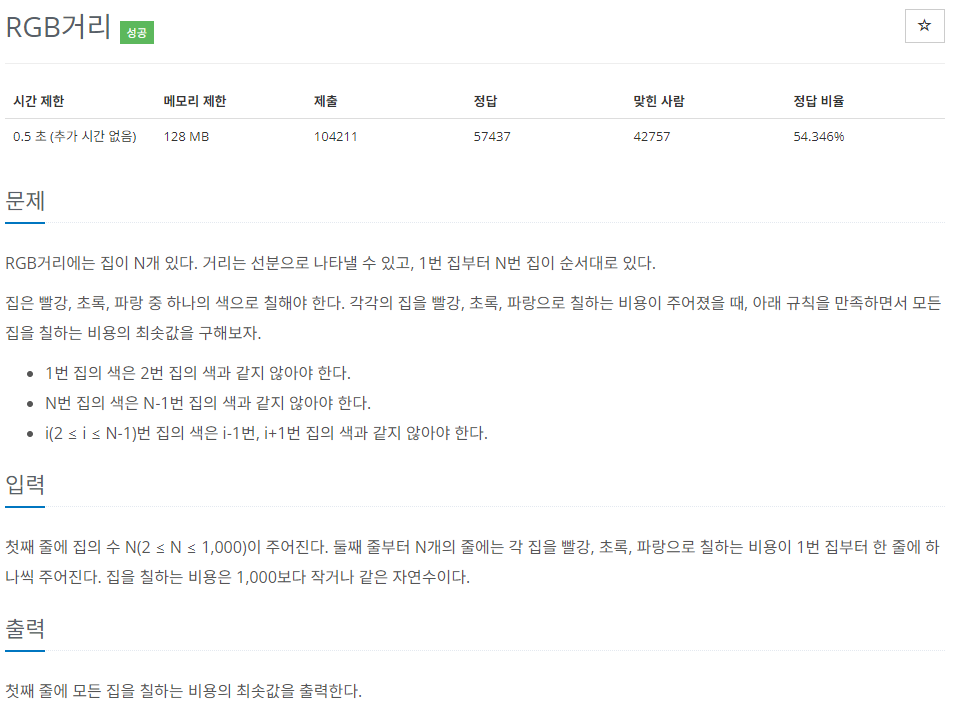 첫째 줄에 집의 수 N(2 ≤ N ≤ 1,000)이 주어진다. 둘째 줄부터 N개의 줄에는 각 집을 빨강, 초록, 파랑으로 칠하는 비용이 1번 집부터 한 줄에 하나씩 주어진다. 집을 칠하는 비용은 1,000보다 작거나